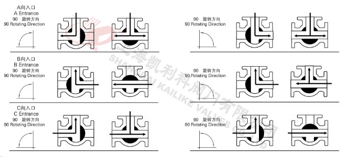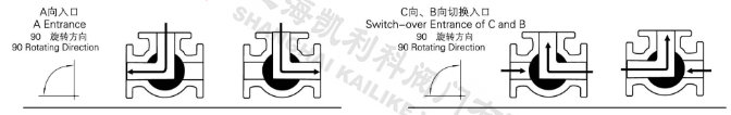 電動(dòng)低溫三通球閥分L型和T型,介質(zhì)流通方向見下圖。L型電動(dòng)三通球閥適用于介質(zhì)流向的切換,能使相互垂直的兩個(gè)通道連通:T型電動(dòng)三通球閥適用于介質(zhì)的分流、合流或流向 切換,T型孔道可以使三個(gè)通道互相連通或使其中兩個(gè)通道連通,電動(dòng)三通球閥一般采用三個(gè)閥座結(jié)構(gòu),亦可根據(jù)用戶要求采用四閥座結(jié)構(gòu)。